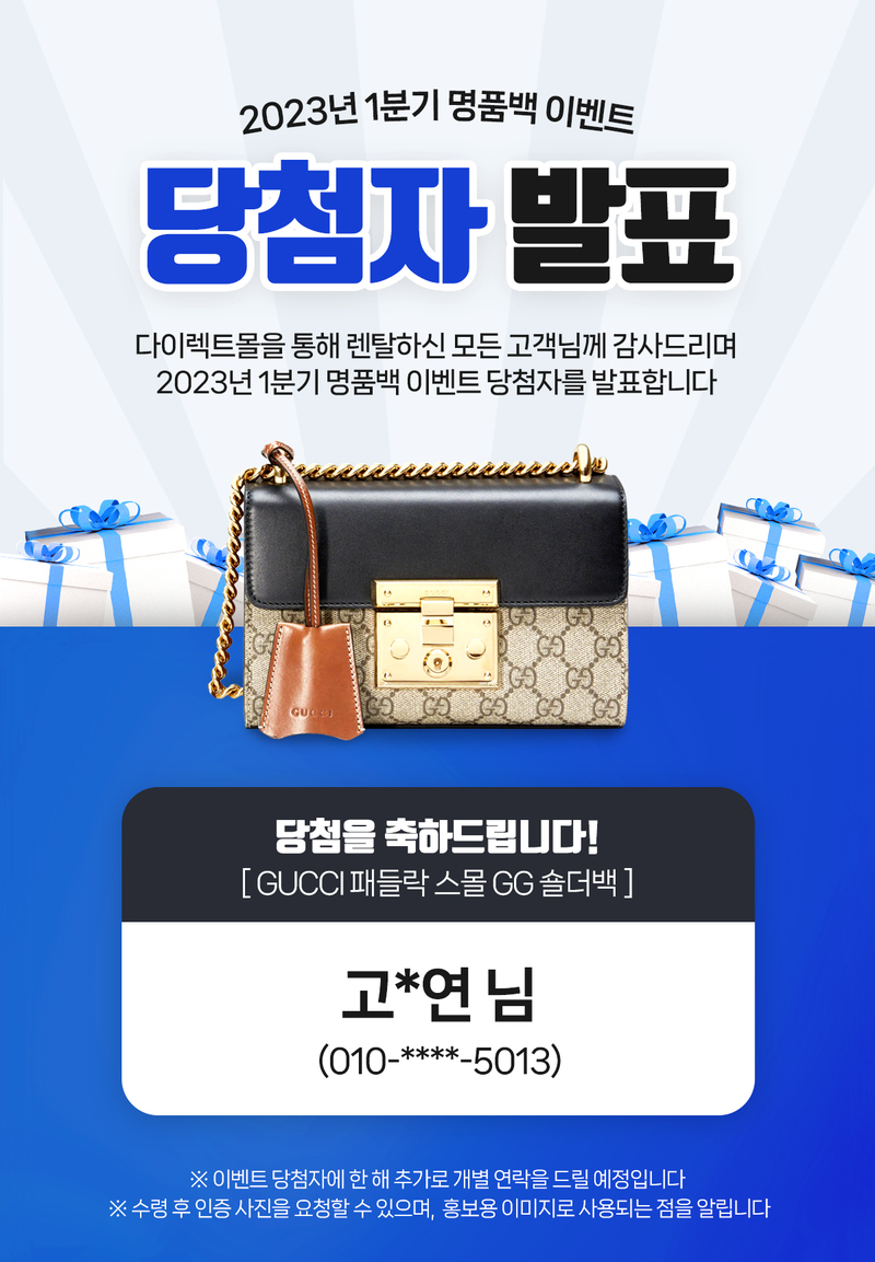 2023년 1분기 (3월) 명품백 이벤트 당첨자 안내입니다. 2023-04-05 현대렌탈케어 주요 고객사 생활의 현대렌탈케어, 지속적인 품질의 고급화와 기술력 혁신을 통하여 글로벌 기업으로서 비전을 실현해가고 있습니다. 1599-9601 고객님께 가장 알맞은 제품으로친절하게 상담드리겠습니다.